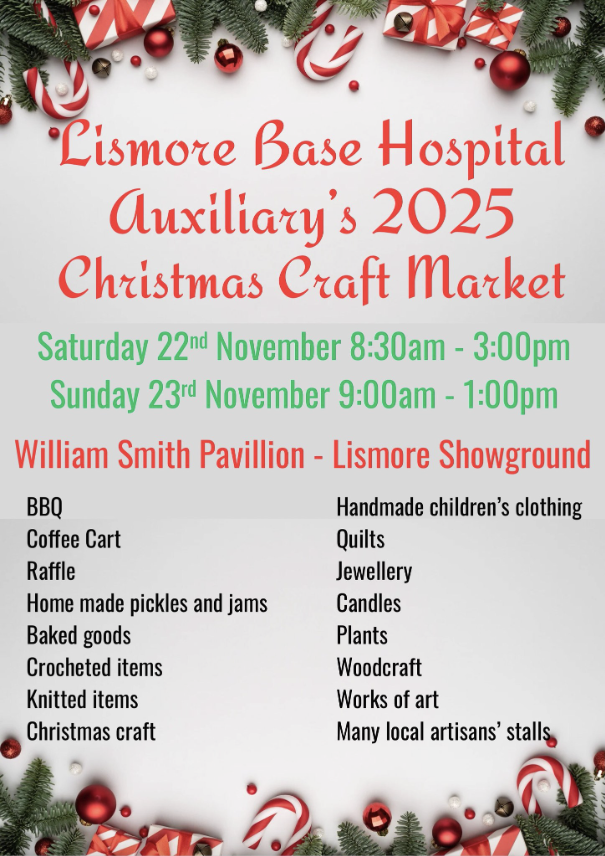 The Lismore Base Hospital Auxiliary Christmas Market is on Saturday and Sunday, November 22 and 23 in the William Smith Pavilion at the Lismore Showgrounds.