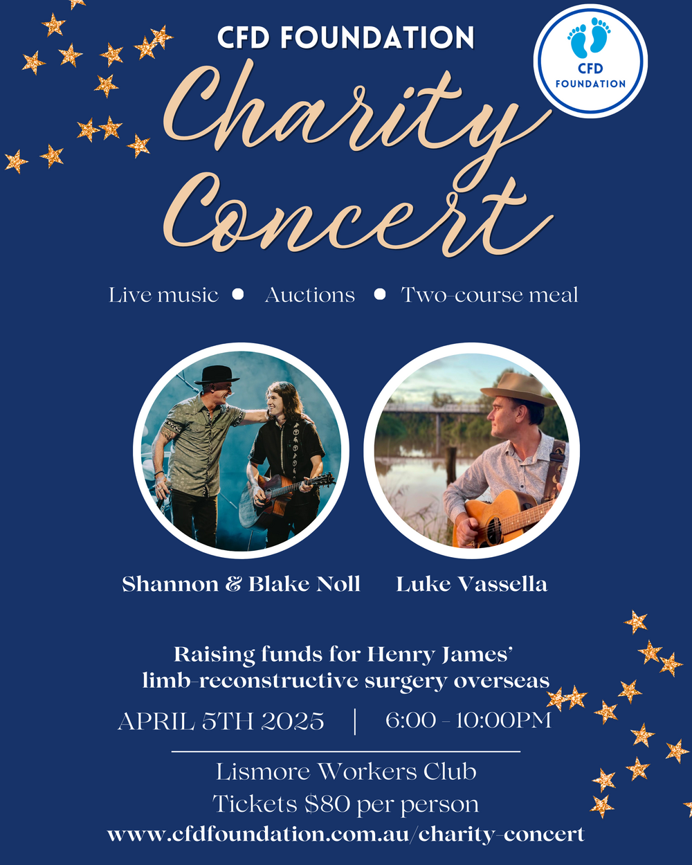 The CFD Charity Concert will be held on Saturday, April 5, at the Lismore Workers Club. Tickets can be booked through the CFD Foundation website.