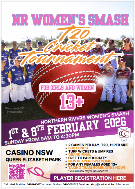 Riding this new wave of female cricket participation, the Casino Cricket Club is excited to announce the Northern Rivers Women’s Smash, a welcoming two‑day T20 cricket competition designed to grow and celebrate women’s cricket in the Northern Rivers.