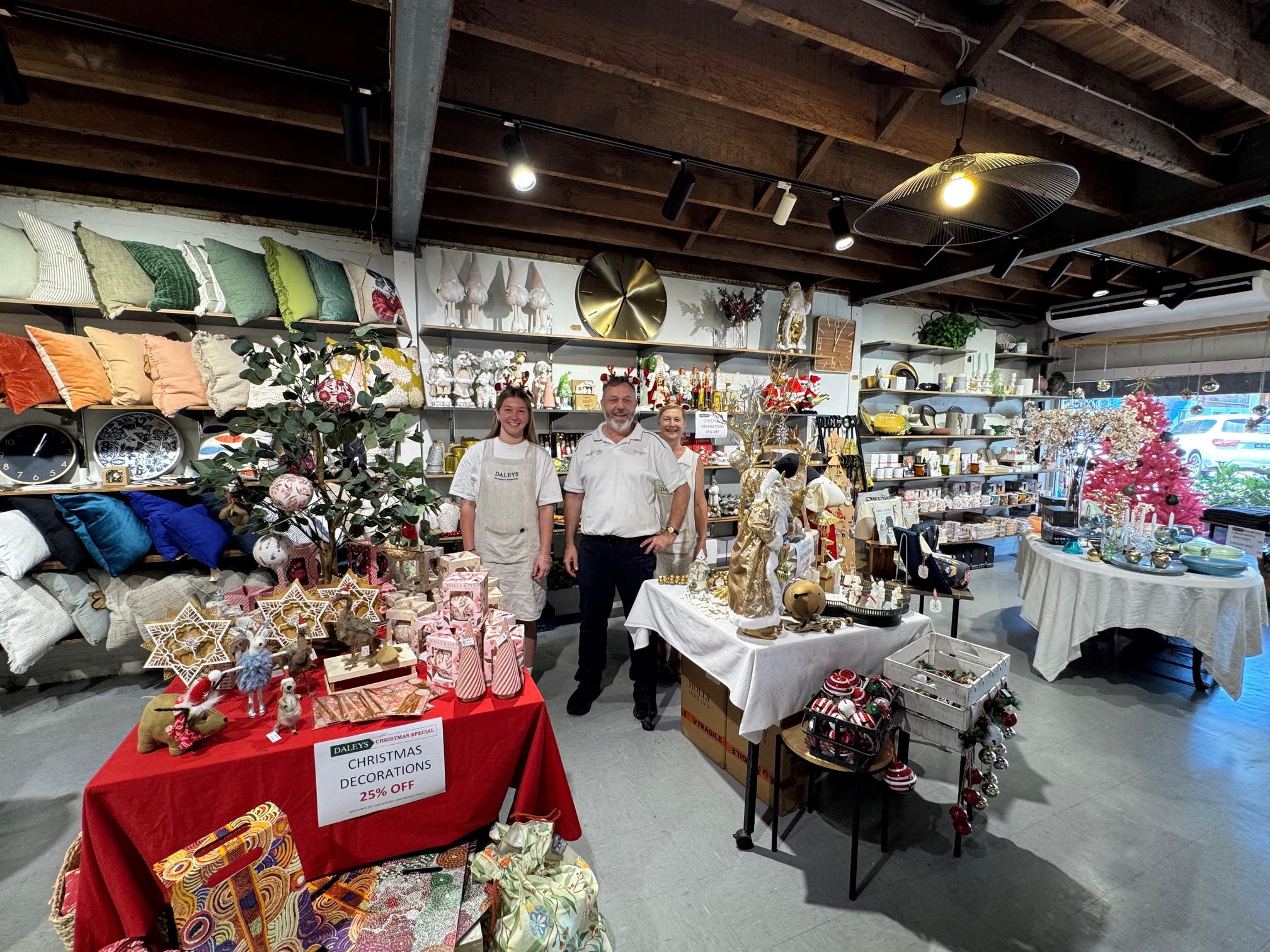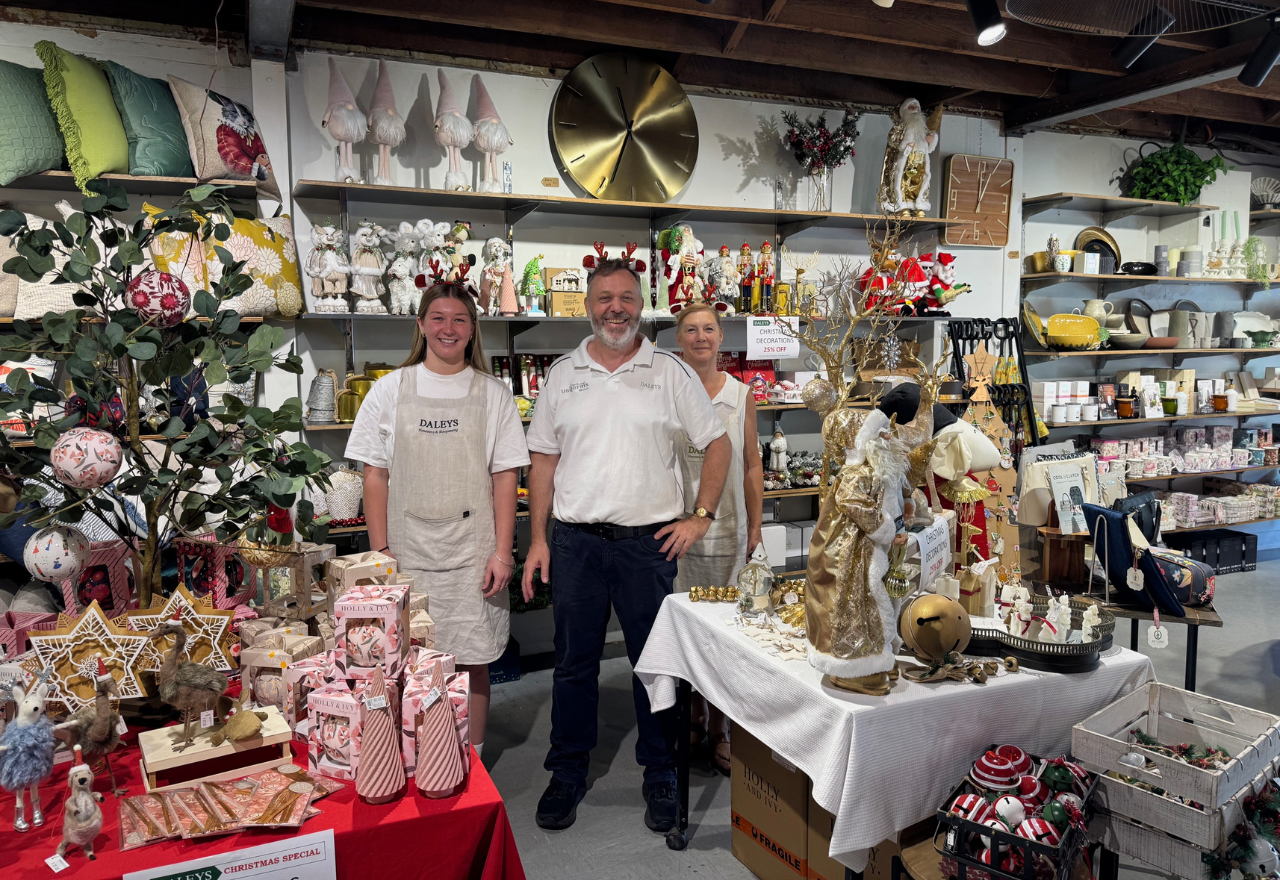 Iliara, Matt Healy and Caterina in front of the Christmas section of Daleys Homewares on Keen StreetIn early December, the Australian Retailers Association and Roy Morgan released research results that said 68% of adult Australians were planning to buy Christmas gifts this year, which is 9% down on 2024.