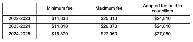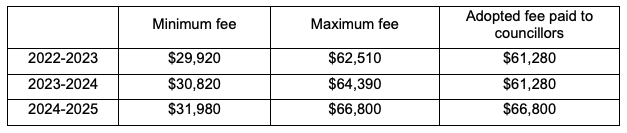 The maximum fee for 2025/26 is $68,800 for the Mayor and $27,860 for each councillor. As per a vote in April 2022, a superannuation payment will be made on top of that fee. As it is with any other employee/salary earner.