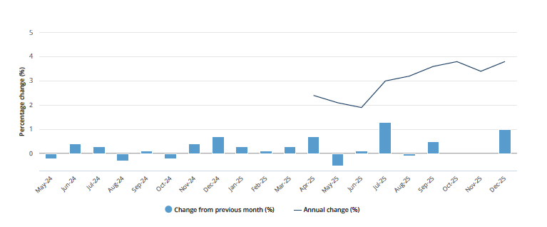 The Consumer Price Index (CPI) rose 3.8 per cent in the 12 months to December 2025, according to the latest data from the Australian Bureau of Statistics (ABS).