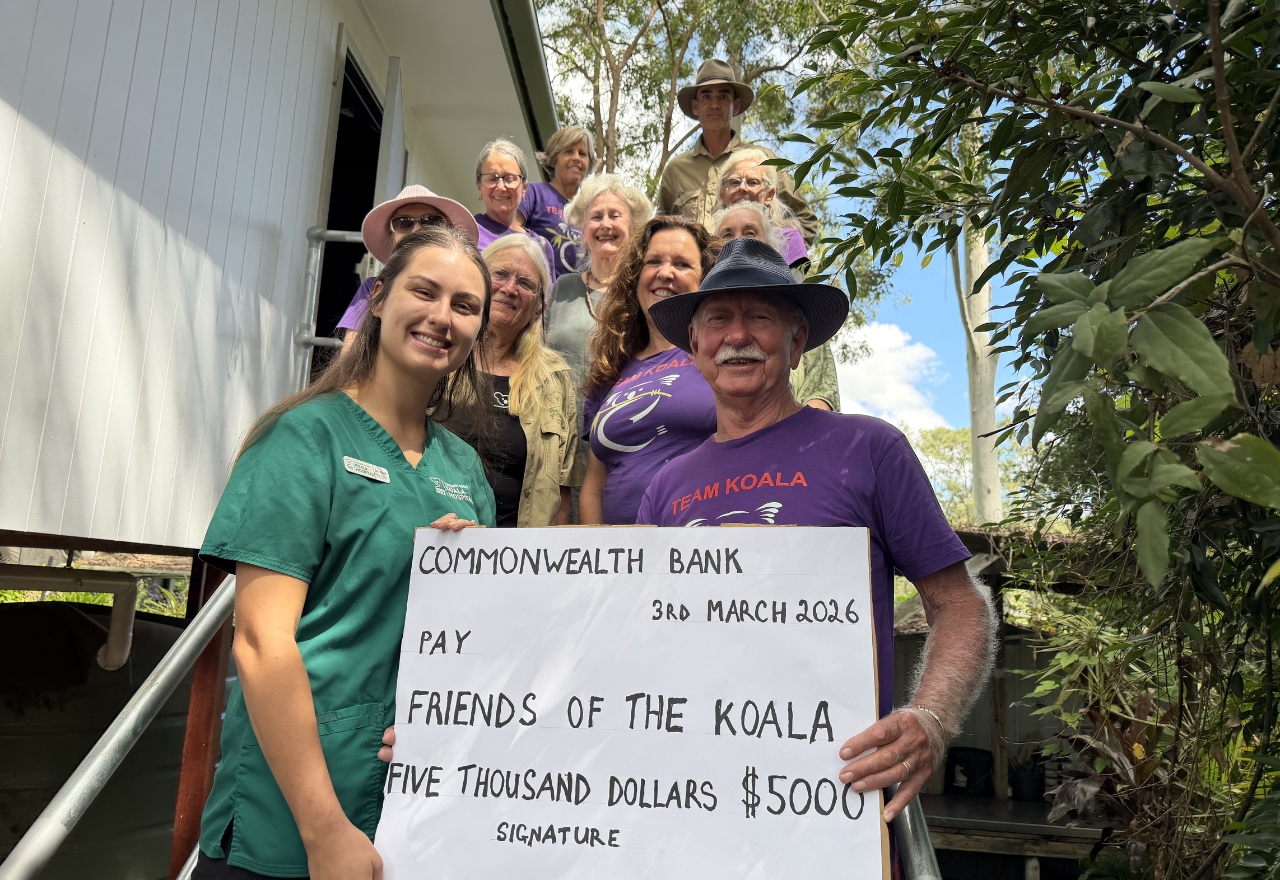 Dr Kate Thomas accepts the cheque from Team KoalaOn World Wildlife Day, with gum leaves rustling in the background and volunteers gathered in East Lismore, Friends of the Koala marked the beginning of a new chapter, launching a major expansion of the Northern Rivers Koala Hospital as part of its 40th anniversary year.