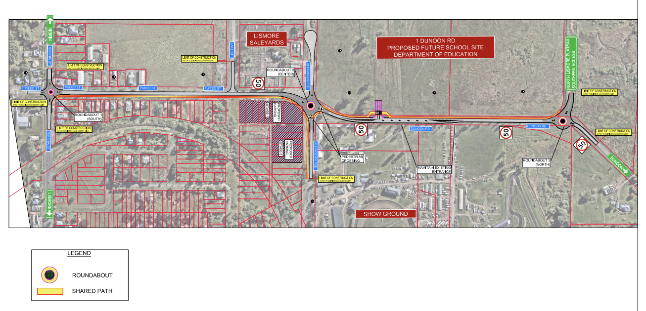 Specifically, Tweed Street and Terania Street intersection to be upgraded; new shared path along Tweed Street; Tweed Street to be widened and upgraded; Lake Street entrance to be upgraded and sealed; Alexandra Parade/Tweed Street/Dunoon Road intersection to be upgraded with a roundabout; provisions for a future carpark on the south-west corner of Tweed Street / Alexandra Parade to be designed; Alexandra Parade to the viaduct upgrade – eastern side; Alexandra Parade to end of cattle sale yards to be upgraded and sealed; Dunoon Road to the second roundabout to be upgraded; Dunoon Road third roundabout and shared path along Dunoon Road.