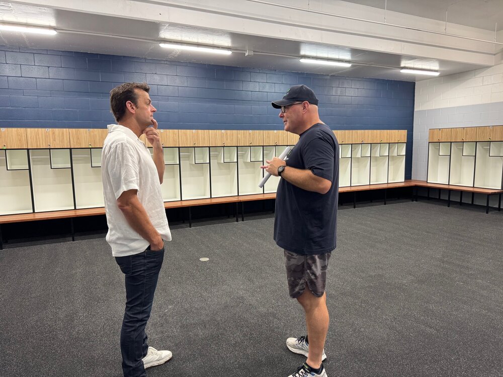 (Mayor Steve Krieg shows Gilly through the change rooms at the new Adam Gilchrist Pavilion)