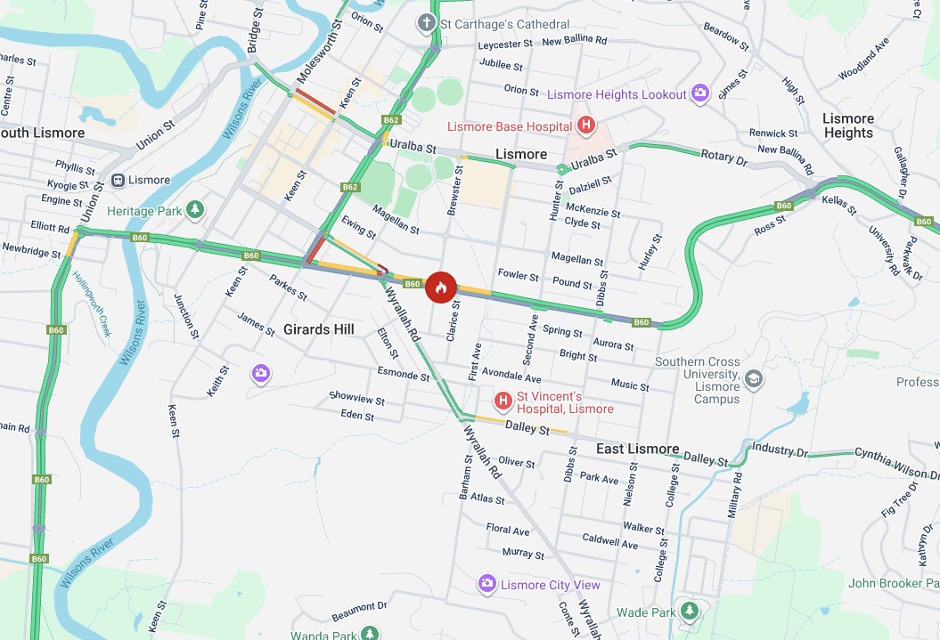 The westbound lane is closed to traffic, so you will need to take an alternative route to get to South Lismore.