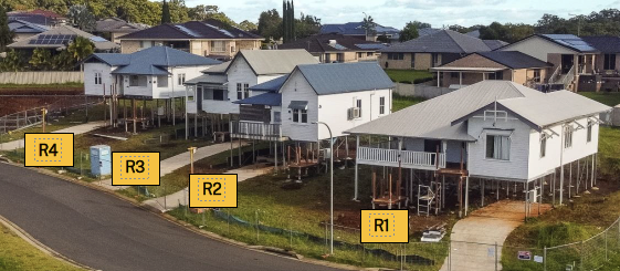 (The new Multitask build on the left, next to the four relocated buyback houses at Mt Pleasant Estate in Goonellabah)