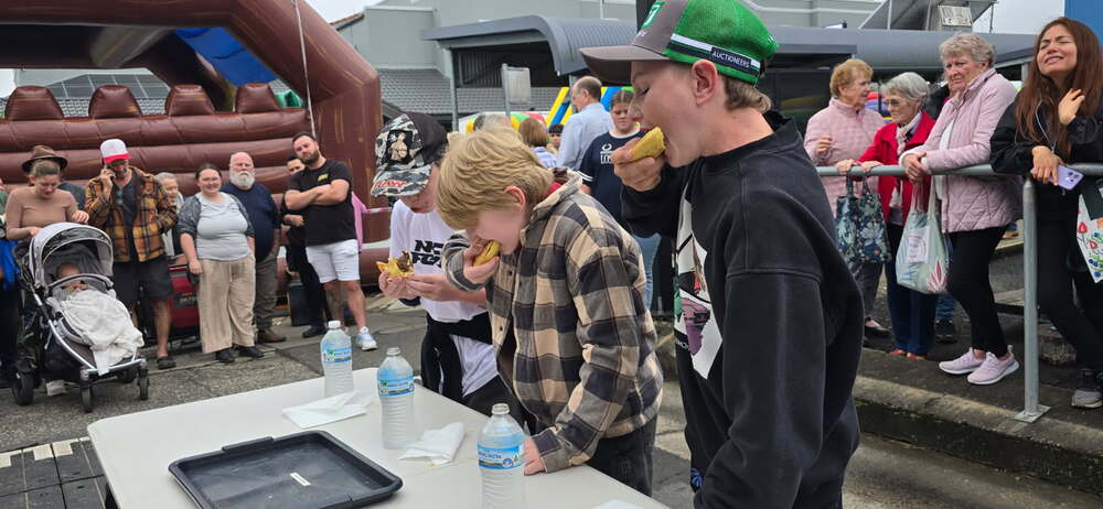 In the Junior Pie-eating competition, Max, Connor and Mac battled it out. Max, a late entry, came out the winner, though all three had big, meaty grins at the end! This was followed by the senior pie-eating competition.