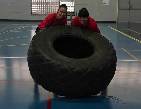 Chris Vanbibber, the GSAC trainer, was giving Rebekka Battista (Our Kids Fundraising Coordinator) and Samantha Gordon, who assisted Rebekka, some pointers on the tyre lift. Heaving and pushing, the women triumphed, only to take on the jerry can lift and the prowler push.