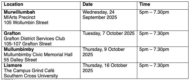 The What Matters Most public workshops are being held in Murwillumbah, Grafton, Mullumbimby, and Lismore (Thursday, October 16). These free workshops welcome all residents, with accessibility requirements accommodated.