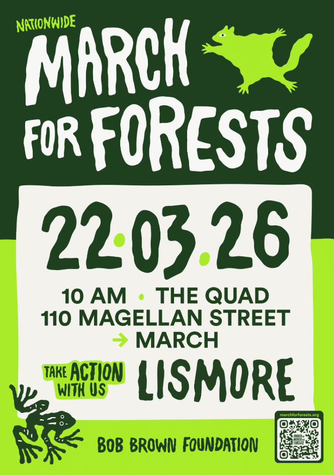 Preparations have begun for the 2026 March in March for Forests, this year to be held in Lismore at The Quad at 10am Sunday 22nd March. A wide array of local musicians and performers will join the stage with some of Australia’s finest forest experts for a morning of entertainment and action.