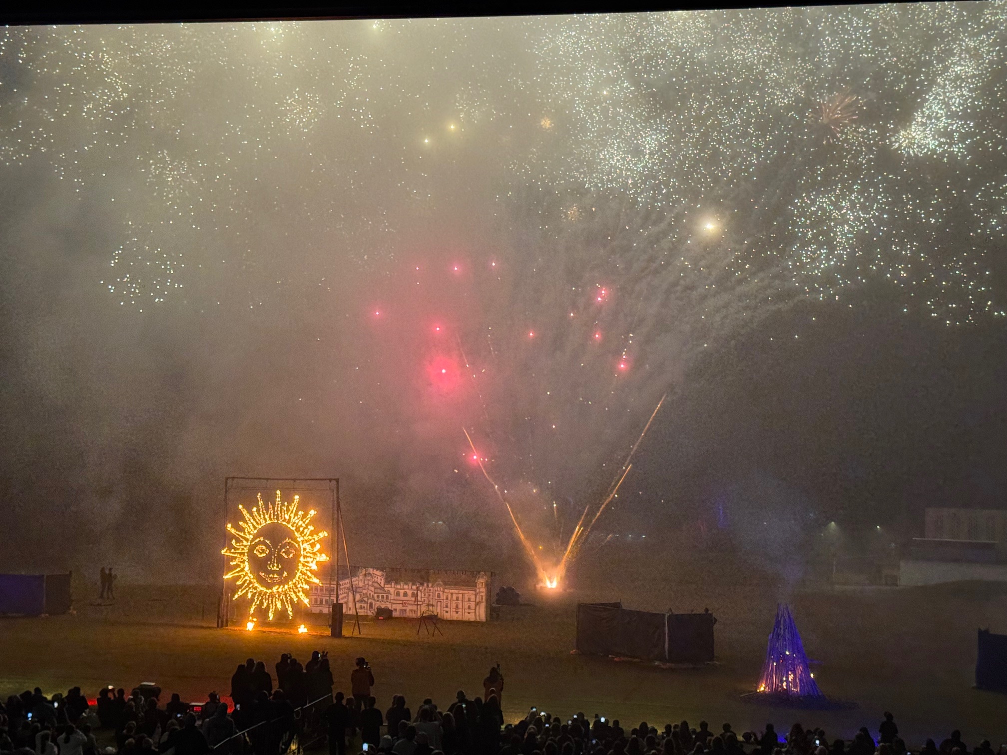 As a large crane and smaller birds moved around the sun, there was uplifting Irish folk music playing, before the sun spoke, bonfires were lit, and the sun was set on fire to an instrumental of The Beatles - Here Comes The Sun.