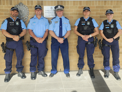 (Commander Dave Roptell (middle) with the latest batch of new recruits at the Lismore Police Station)