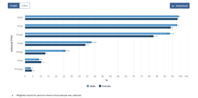 11 types of PFAS were tested for people aged 12 years and over in the National Health Measures Survey. Three types of PFAS were detected in the blood of over 85 per cent of the population, while six types were detected in less than 10 per cent of people. The remaining 2 types of PFAS had detection rates between 15% and 45%.