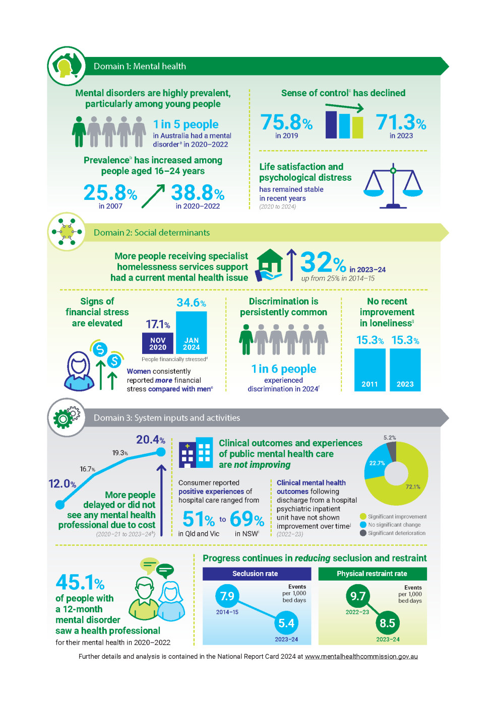 The National Mental Health Commission (the Commission) has released its 2024 National Report Card for the 2024 calendar year, which examines the prevalence of mental health challenges, the drivers behind it and the performance of the mental health system.