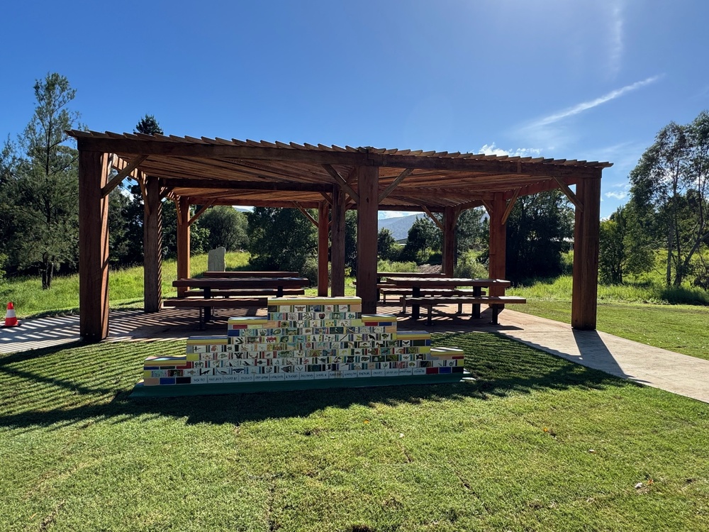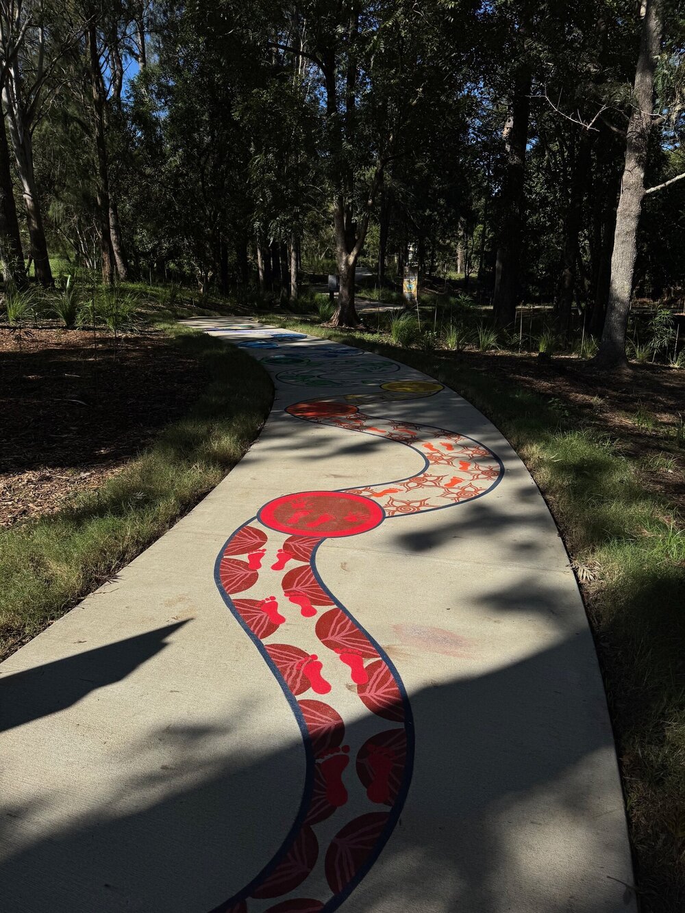 As you walk along the 750 metres surrounded by bushland, you can read the many signs outlining Nimbin's history; you will follow painted footpath artwork, including one with hopscotch surrounded by native animals, sandstone blocks, a magnificent gazebo with a tiled wall painted by students and two sculptures.