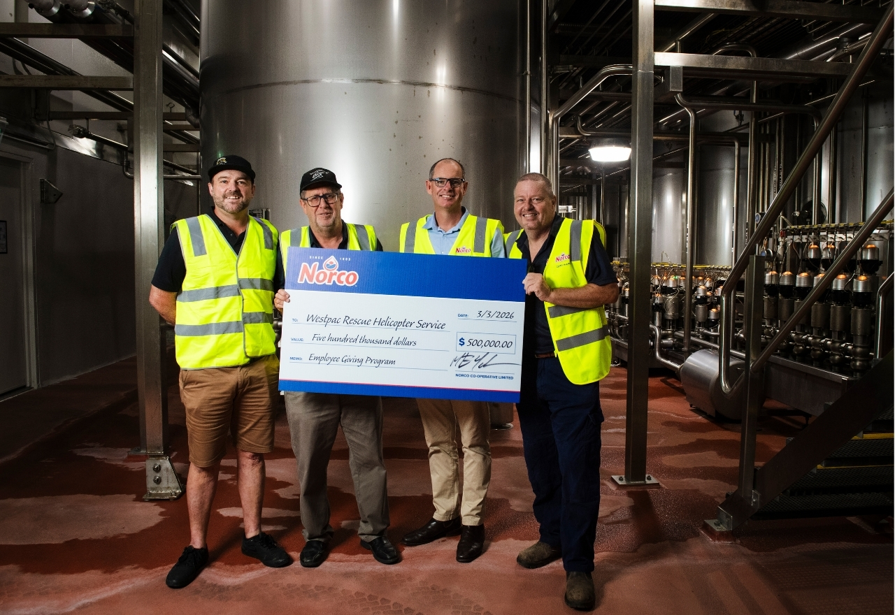 Scott Jones, John Bancroft, Michael Hampson, Rodney BlizzardNorco’s Lismore team recently celebrated a major community milestone, contributing $500,000 to the Westpac Rescue Helicopter Service through its long running employee giving program.