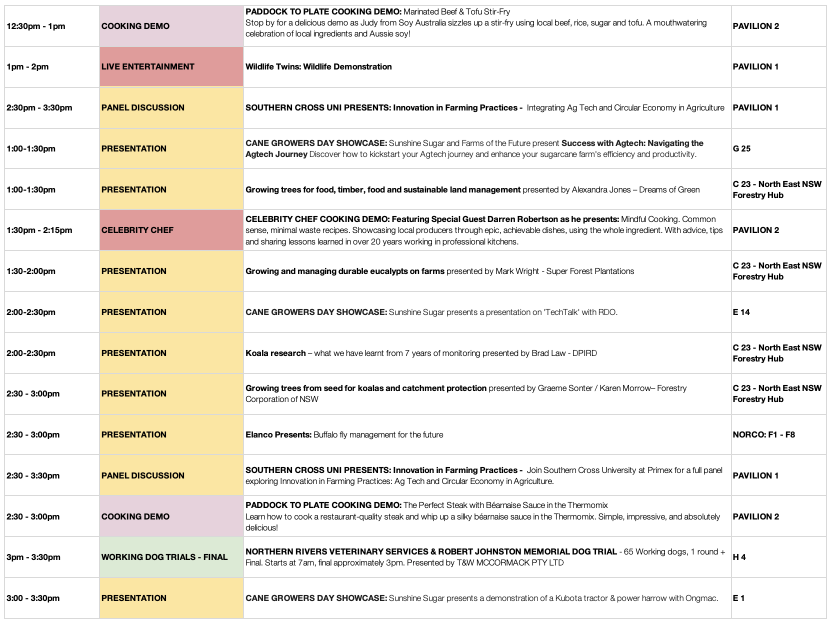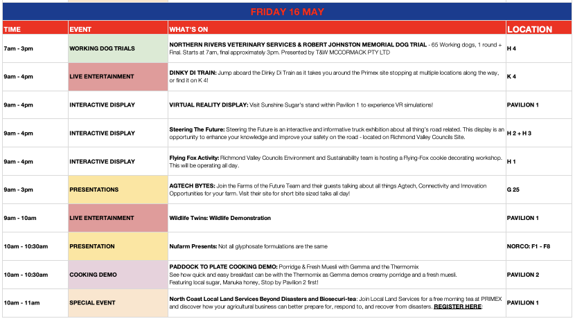 The program for Friday is below, but note that the Working Dog Trials have been cancelled today.
