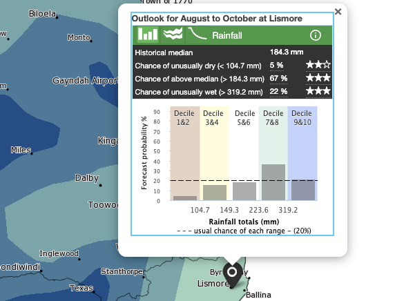 The three months from August to October have a 67% chance of experiencing above-median rainfall (greater than 184.3mm) and a 22% chance of an unusually wet period (greater than 319.2mm). Unusually dry sits at 5%.