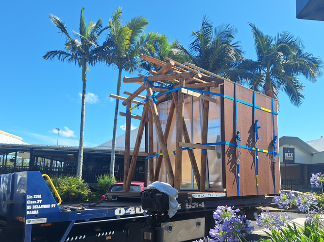 The sample house in transit - all compact, ready for final construction. (Image supplied by Prof. Joe Gattas)