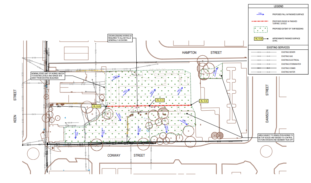 During rain events, the water will fall towards existing stormwater drains on Conway Street and Hampton Lane.