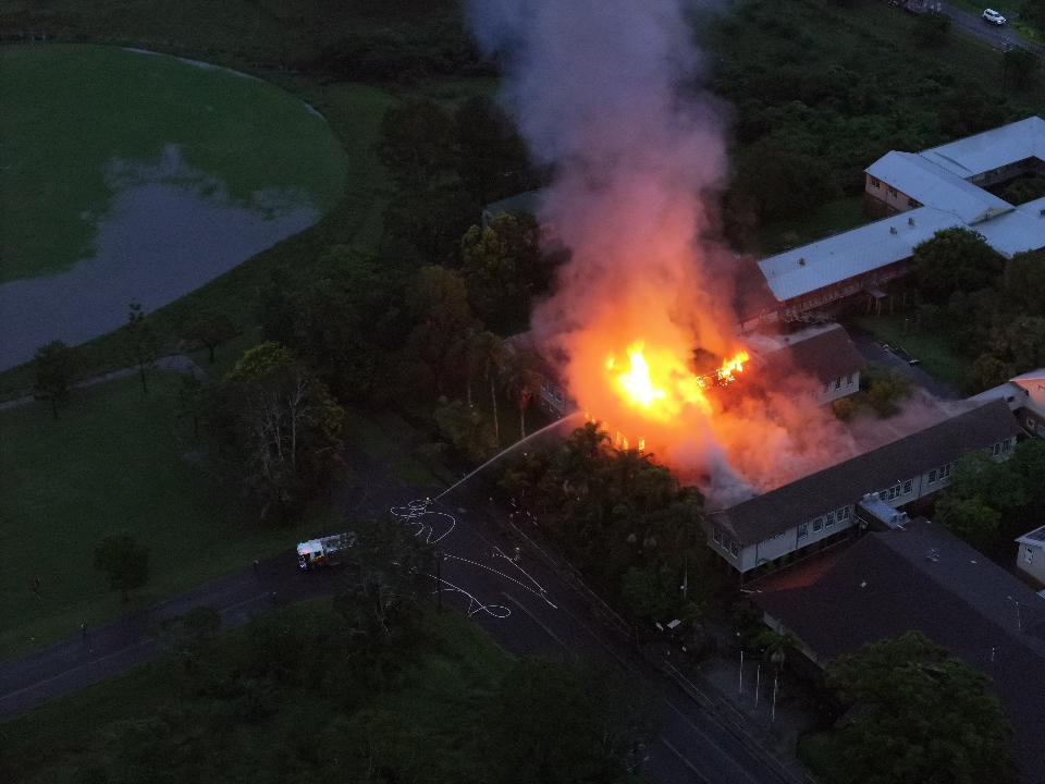 (Firies attempting to dowse the fire at RRHS. Photo: NRs Aerial Photography)