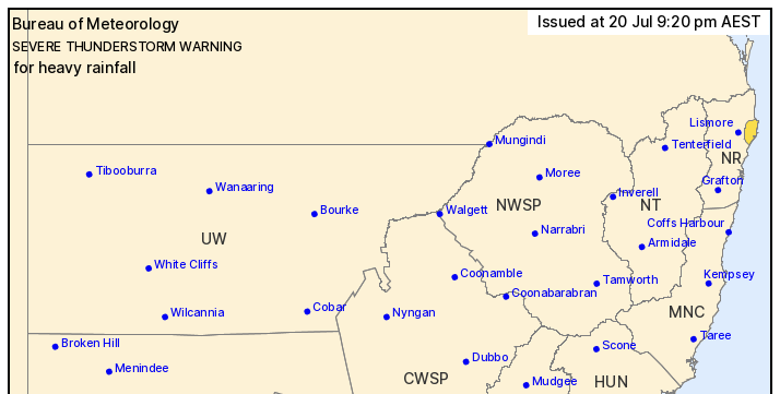 The Bureau of Meteorology has issued a Severe Thunderstorm Warning for Heavy Rainfall for Ballina, Byron Bay and Alstonville.