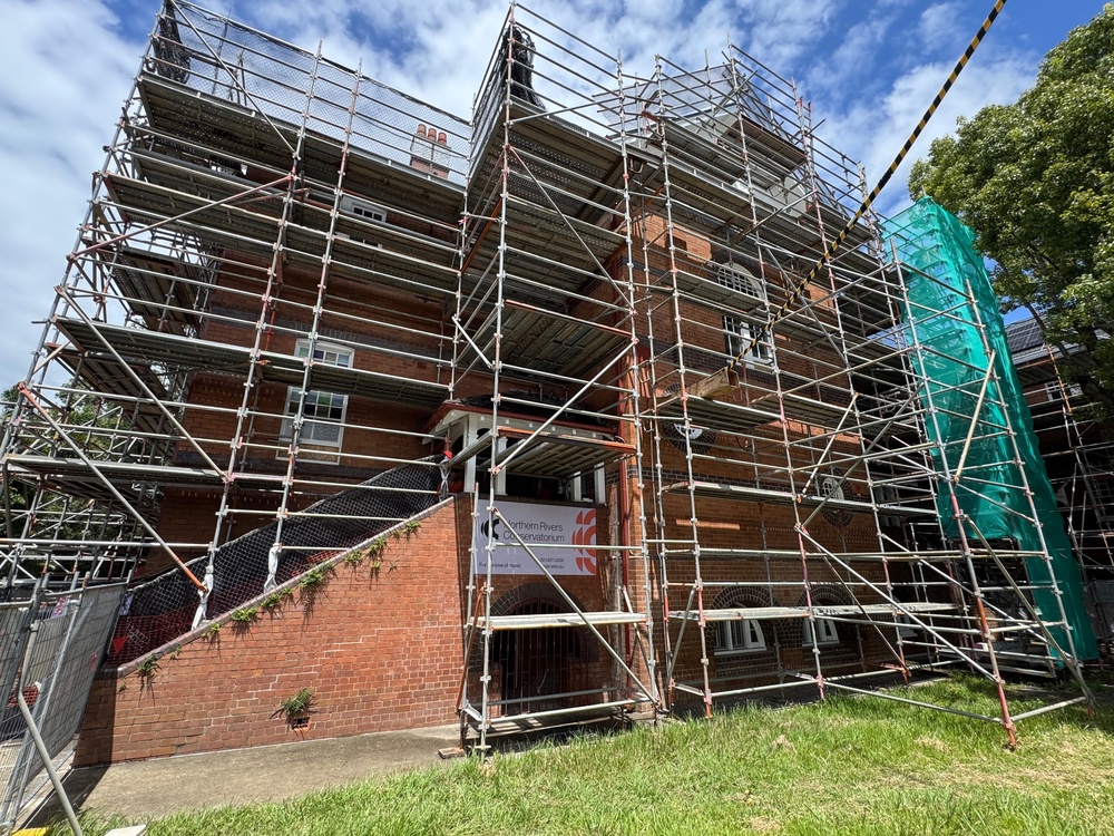 Scaffolding surrounds the building as a new roof is erected and solar panels are installed as part of a $4.8 million program of capital works. The process of replacing the roof uncovered a ventilation turret that dates back to 1902 when the building was constructed.