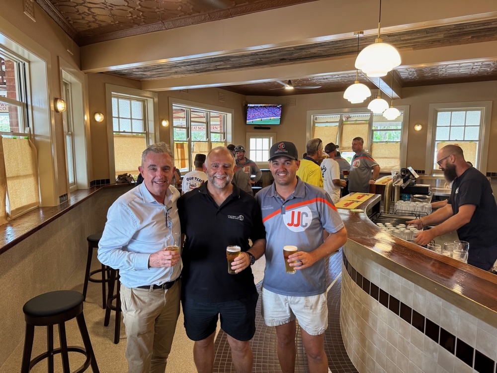 (Federal member for Page Kevin Hogan, Station Hotel proprietor Mark Neilson and Joel Jensen share a beer at Monday's soft opening)