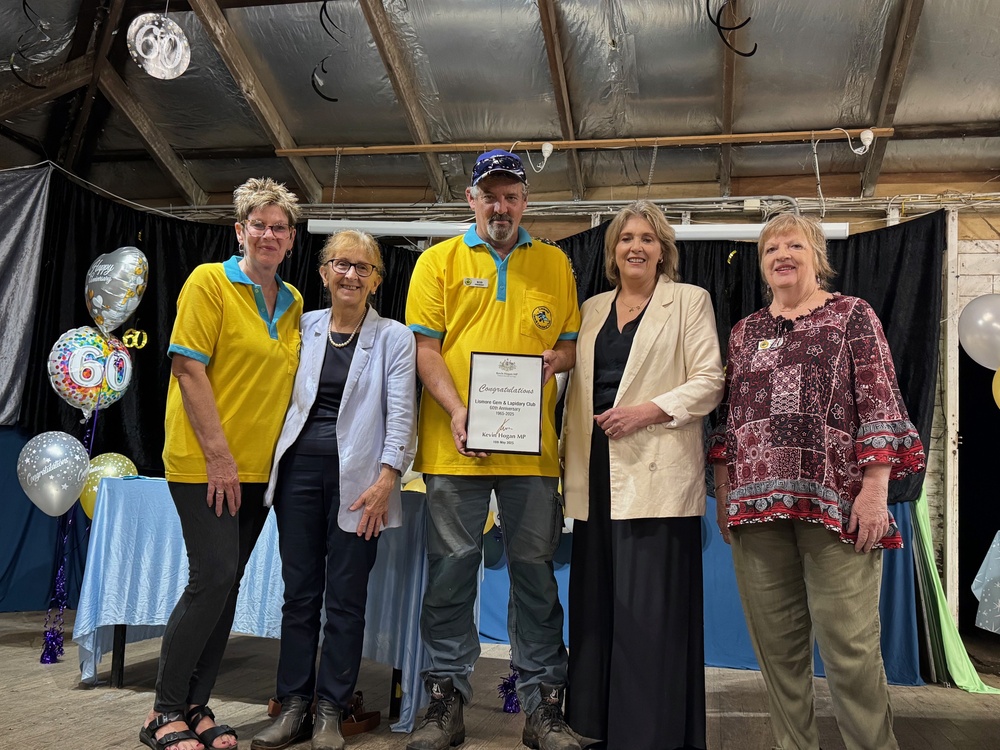 (Celebrating their 60th birthday Friday night and accepting a presentation were Lismore Gem & Lapidary Club's Jenny Vyrenhoek, Member for Lismore, Janelle Saffin, President Rod Knight, Karen Hogan and founding member Heather Bolton)