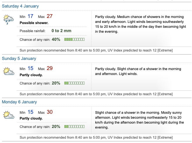 The Bureau says there is a 40% chance of a shower on Saturday with a top of 27 degrees, while Sunday is forecast to be a partly cloudy day with a maximum of 29.