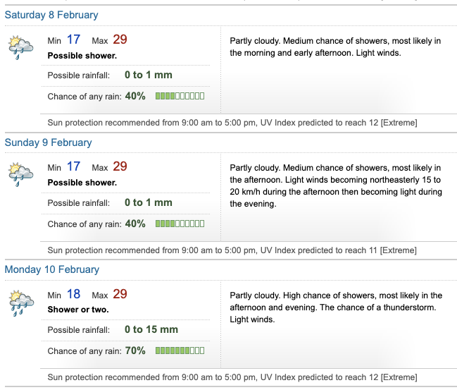 There is the chance of a possible shower; however, the percentage is around 40% and the prediction is for 1mm at most for both days, so if we do get shower it won't last too long.