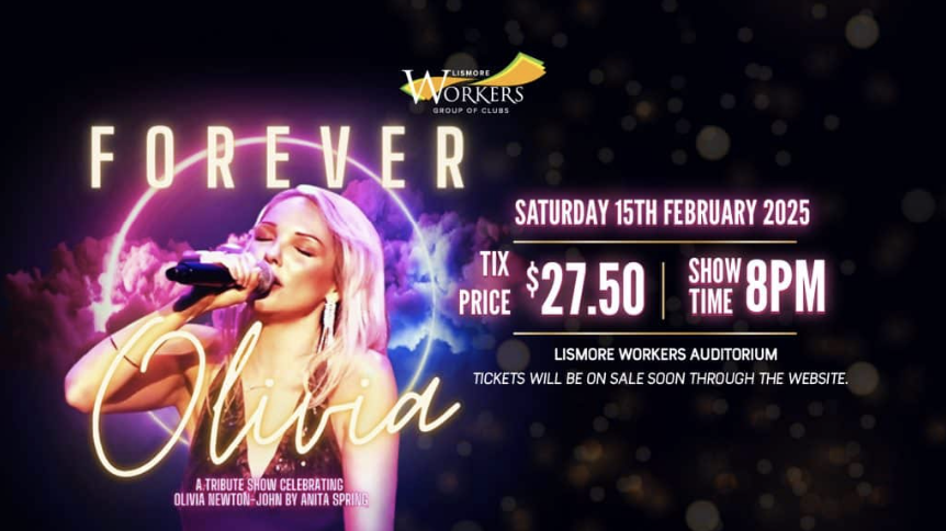 Forever Olivia - A Tribute to Olivia Newton-John will be the first live concert at the Lismore Workers Club next Saturday night (February 15). You can book tickets here Lismore Workers Club website to hear songs like I Love You, Hopelessly Devoted To You, Physical, A Little Bit More to name a few.