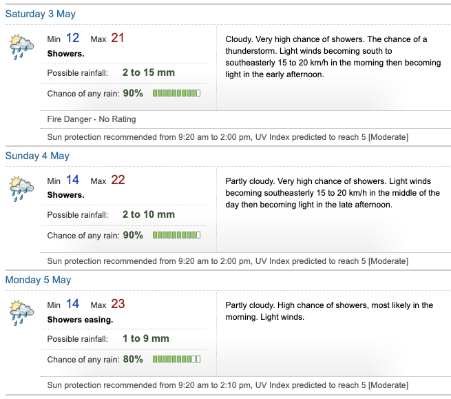 The Bureau of Meteorology predicts 2mm to 15mm on Saturday and 2mm to 10mm on Sunday, with a very high (90%) chance of showers.