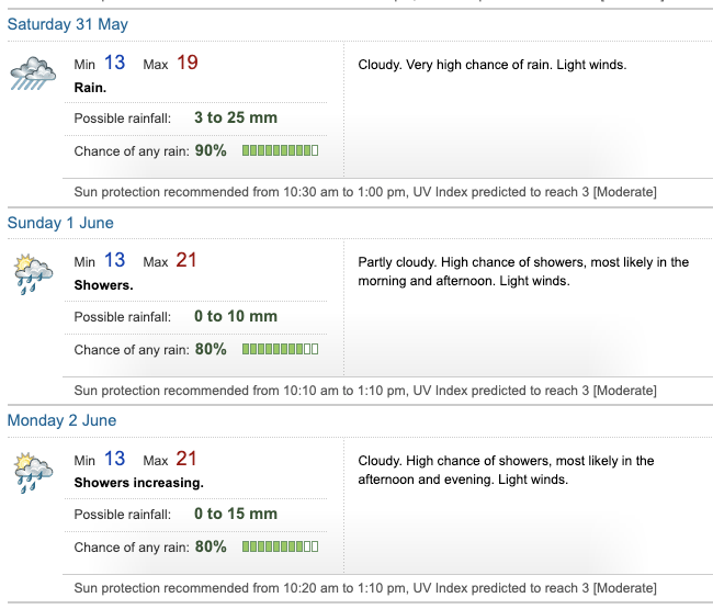 The Bureau of Meteorology is forecasting Saturday to be the worst of the two days, with 'rain' the main word and a 90% chance of 3mm to 25mm falling as winds come from the south.