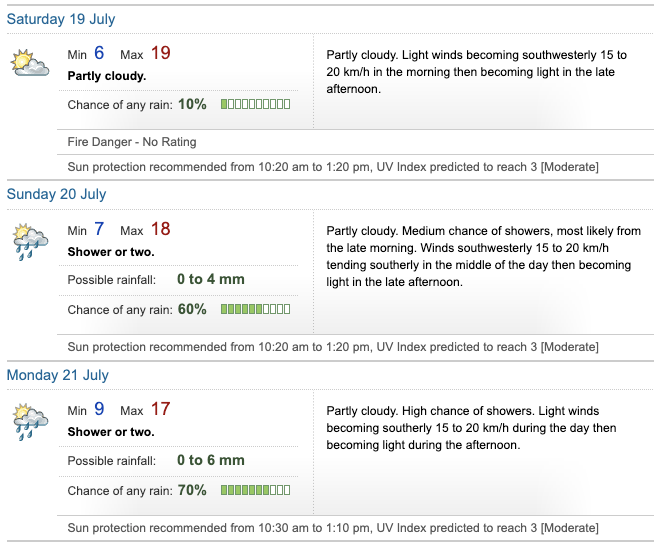 Sunday's weather has a 60% chance of rain, a potential of 4mm and 15 to 20km/h southwesterly winds.