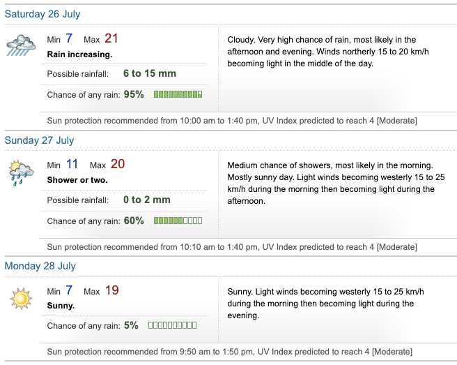 The Bureau of Meteorology (BoM) has been adjusting the potential rainfall for Saturday as the weather systems approach the east coast, and, as we write, the forecast is for 6mm to 15mm with northerly winds.
