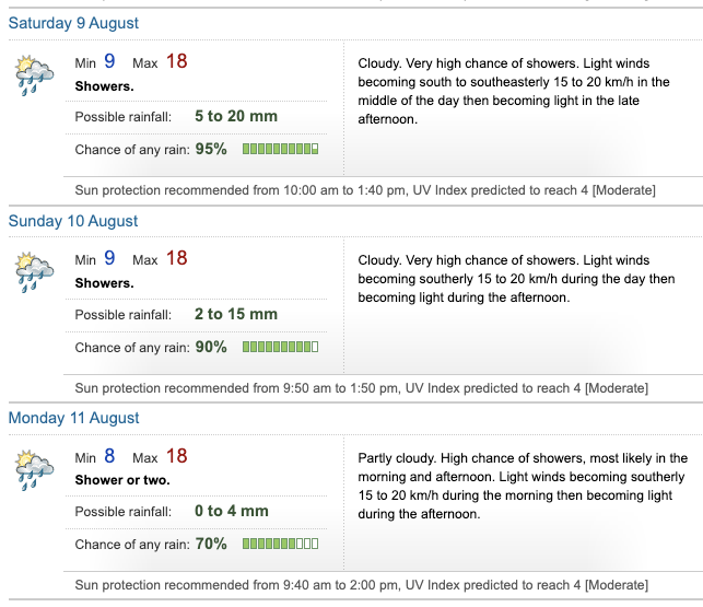 According to the Bureau of Meteorology, if we are lucky, we will only receive 7mm over the two days. However, if we are unlucky, 35mm of rain could fall. The likelihood of any rain is very high, with a 95% chance for Saturday and 90% chance on Sunday.