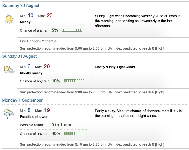 The top temperatures being forecast by the BoM are 20 degrees, after a cool start, especially on Sunday, which is expected to be 6 degrees.