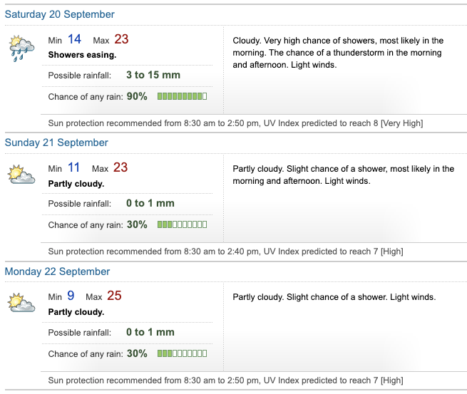 A wet Saturday morning, then partly cloudy conditions for the rest of the weekend is the forecast from the BoM.