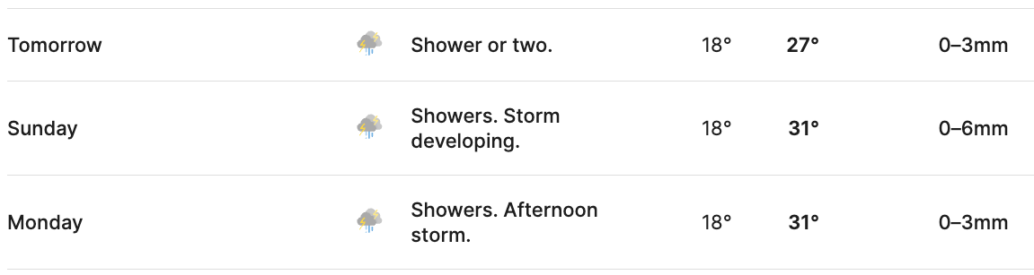 As usual, this time of year, it will be warm with 27 and 32 degrees predicted for Saturday and Sunday.