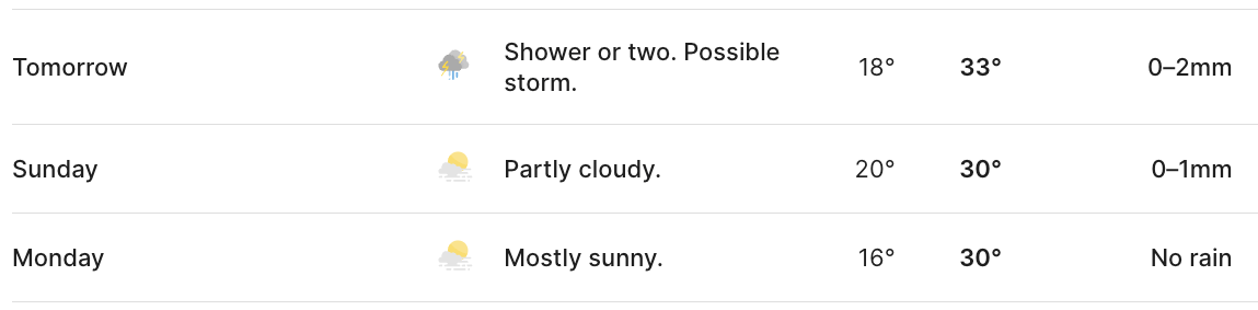 Saturday's forecast is for up to 2mm of rainfall and a warm 33 degrees, with strong northwesterly winds of 20-30 km/h. The fire danger will remain moderate.