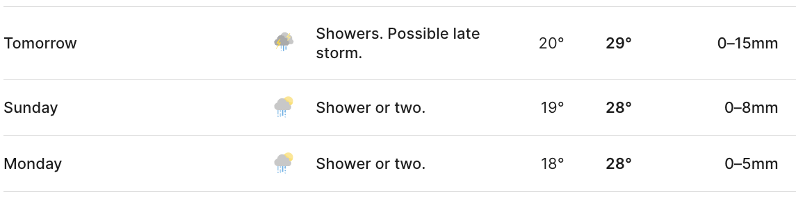 The Bureau of Meteorology rain range is 0-15mm on Saturday and 0-8mm on Sunday. The reason is due to the potential thunderstorms in the late afternoon or evening. In certain locations, they could be severe, with damaging winds, large hail and heavy rain.