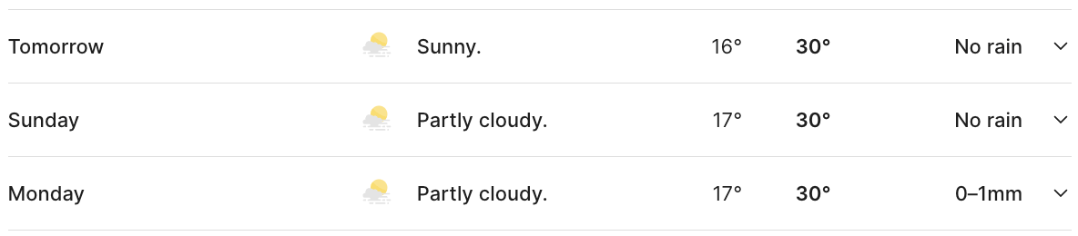 Sunny and partly cloudy sum up the forecast from the Bureau of Meteorology, with warm 17-degree minimum temperatures and highs of 30 degrees.
