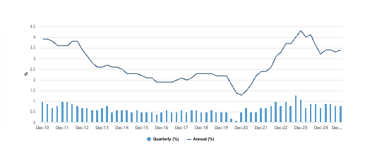 Private sector wages rose 3.4 per cent over the same period. This was higher than the 3.3 per cent growthrecorded in the year to December 2024.