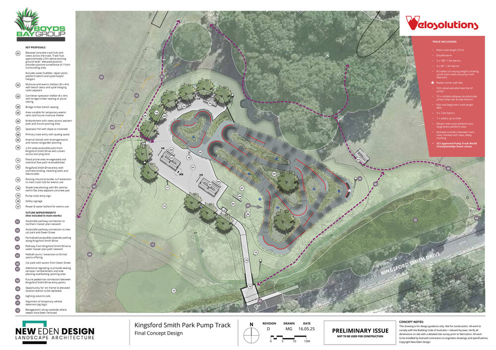 The new pump track will be built to national qualifier event standards, making it eligible to host events as part of the pump track world championship series. In addition to the main competition level pump track, there will be a junior pump track, alternate advanced line and a surrounding precinct featuring trackside hardstand for spectators and participants, with shelters, seating, bike stands, drinking fountains, a workstation, and landscaped areas and shade trees.