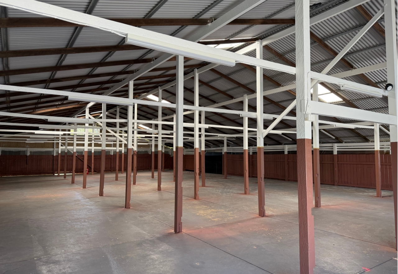 Beyond cages, the pavilion will receive freshly painted timbers, mechanical ventilation, new epoxy flooring, new side walls, and weatherboards that still line the perimeter will remain as a visible link to its agricultural past.